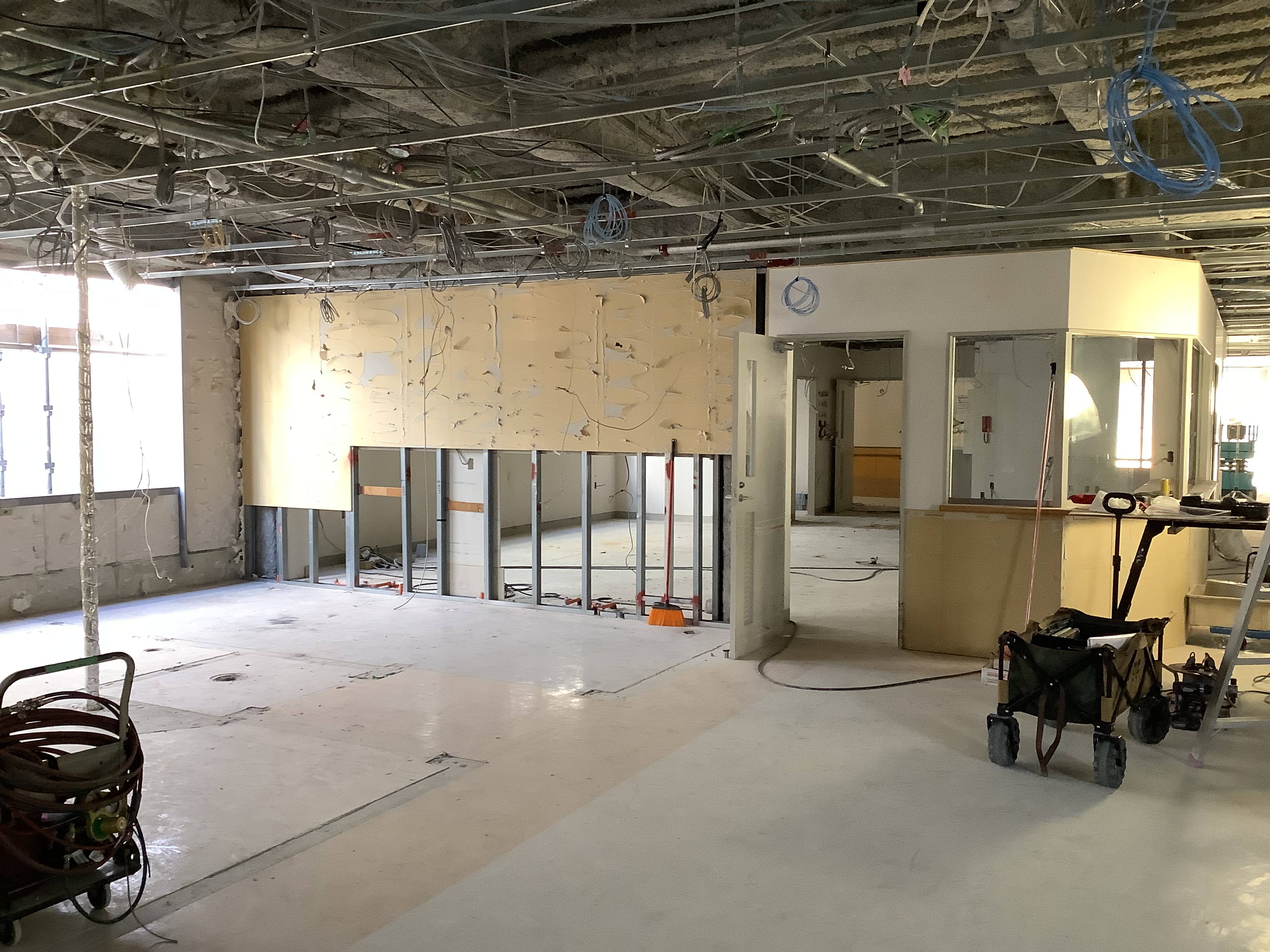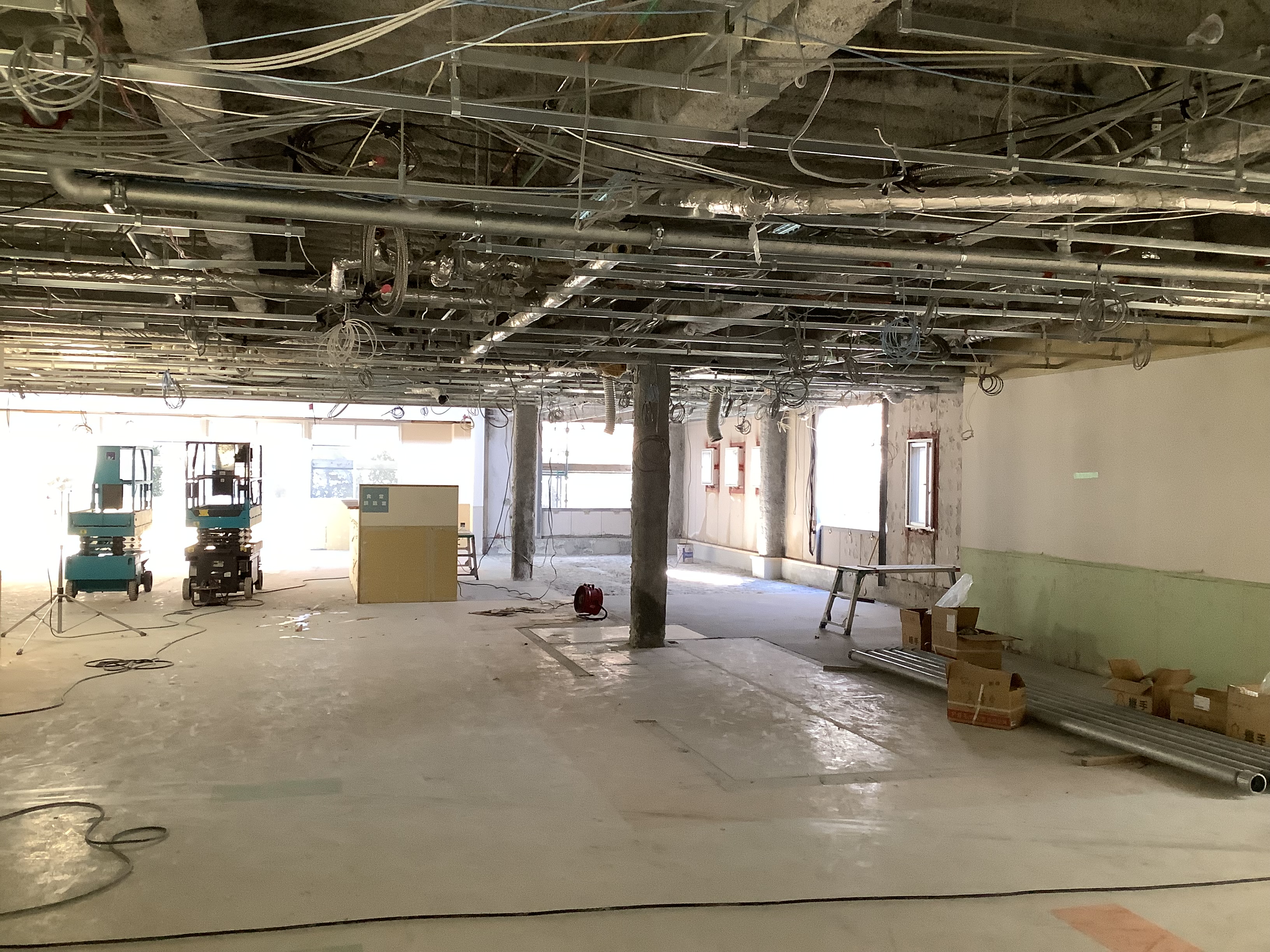 天井の配線・配管が露出し、旧ナースステーション周りの壁も撤去され、広い空間が見えてきました。これから新しいレイアウトに合わせて、壁の造作や設備機器の設置が進んでいきます。